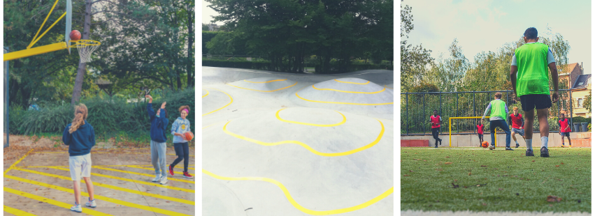 Dit is de tweede sportzone die in het park wordt gerenoveerd. De heraanleg van de voetbal- en streetbasketvelden werd in september 2021 voltooid. Deze laatste voldoet nu aan de normen voor drie-tegen-drie wedstrijden. De zone biedt ook twee basketringen voor trainingen met vrienden of familie, waaronder een voor de kleintjes, een voetbalveld met een grote tribune en een zone voor stretching. Een waterpunt en toiletten bevinden zich in de buurt van de terreinen.