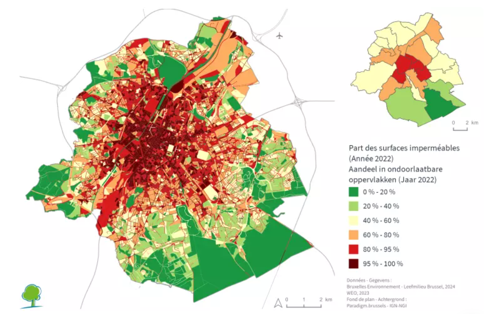 Saviez-vous que plus de la moitié de la Région est couverte de surfaces imperméables ? C'est ce que montre le rapport annuel 2023 de Bruxelles Environnement en s'appuyant sur la carte des surfaces imperméables. Cette carte a été obtenue grâce à l'intelligence artificielle basée sur l'interprétation d'images satellites et de photographies aériennes. L'augmentation des surfaces imperméables constitue non seulement un défi pour la gestion des eaux pluviales et pour la protection des sols, mais a également un impact sur l'environnement et l'habitabilité de la ville. La carte montre l'évolution de ces surfaces. Elle permet également de prendre des mesures de gestion de l'eau et d'étudier plus en détail l’impact de la surface imperméable sur le cycle de l'or bleu.