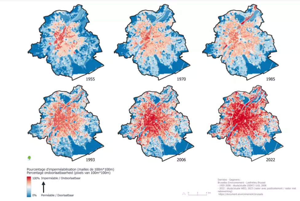 La carte de Bruxelles Environnement montre une augmentation de l’imperméabilité des sols